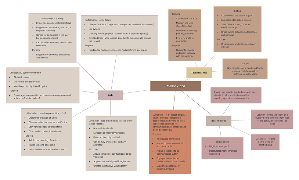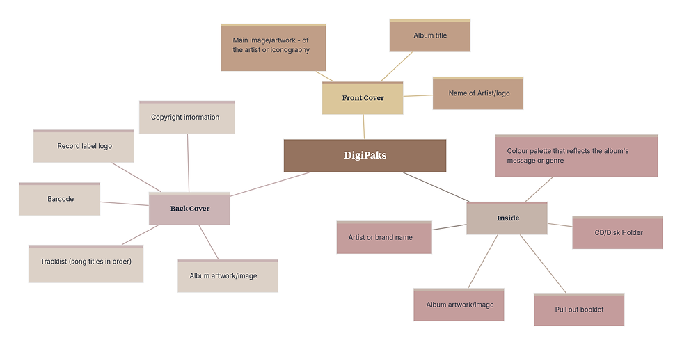 The foundation of my research and planning starts with understanding the project in its entirety. I created two mindmaps about conventions in Digipaks and Music Videos.