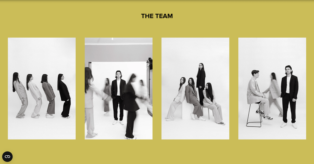 The team section features black and white portraits of the members, photographed in a natural and expressive manner. This aesthetic choice creates a sense of authenticity and individuality while maintaining visual cohesion.